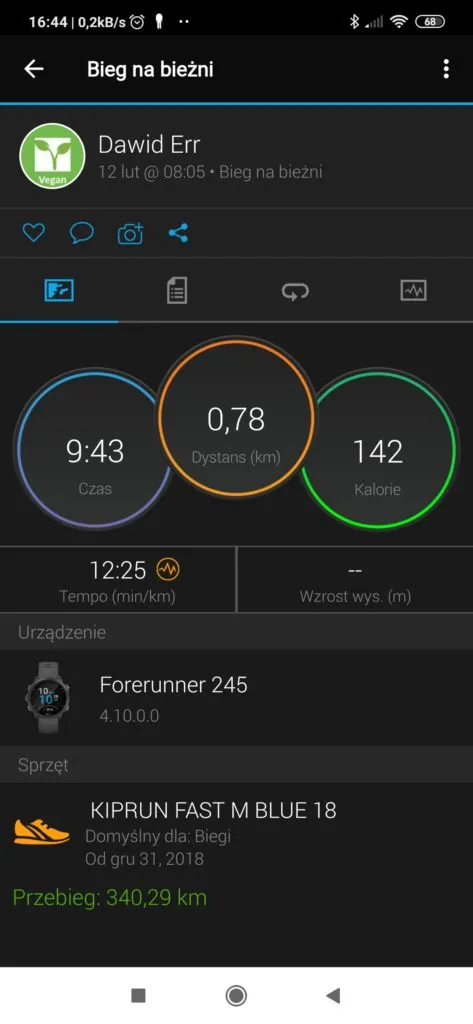 Tym razem bez większego szaleństwa. Założone tempo to moje tempo M czyli 4:44. Za cholerę nie mogę utrzymać takiego tempo. Albo za szybko, albo za wolno. Ostatnie kilkaset metrów postanawiam mocniej przycisnąć i wyprzedzić parę osób dla radochy 😸.